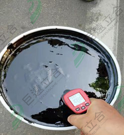 将立合剂桶盖打开,置于液化气灶上,点燃液化气灶,用干净的金属棒将立合剂上下搅动(木棒上的木屑会进入材料内,会堵塞喷嘴)。用红外线测温枪测温,夏季加热温度为120℃,冬季加热温度为150℃。
